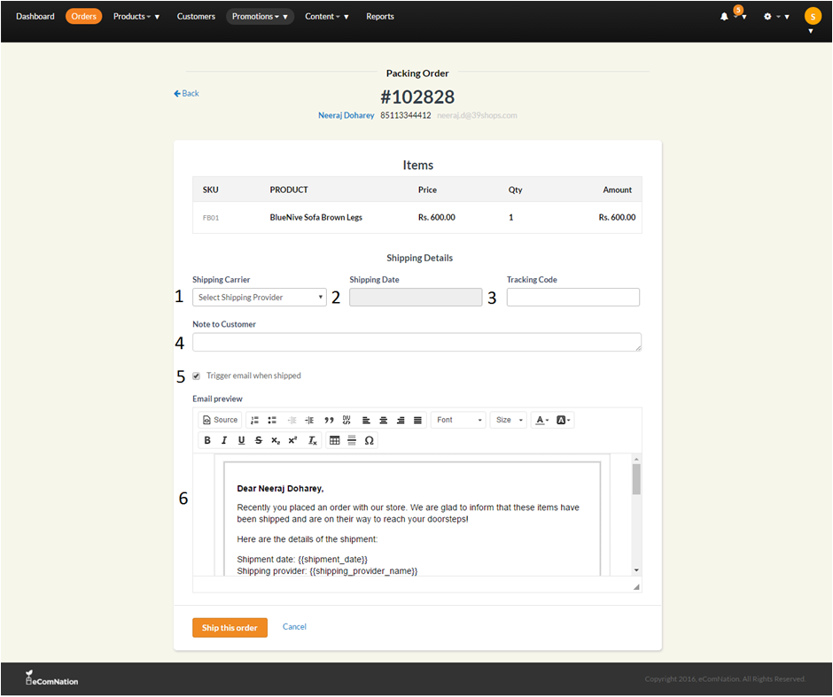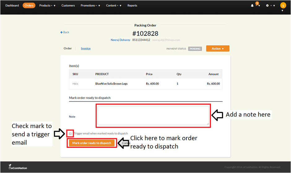 If your order is ready to dispatch, click on ready to dispatch and enter the required information and send a trigger email to the customer.