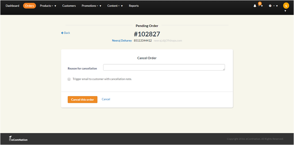 You can also cancel the order by clicking on Cancel under the Actions tab.