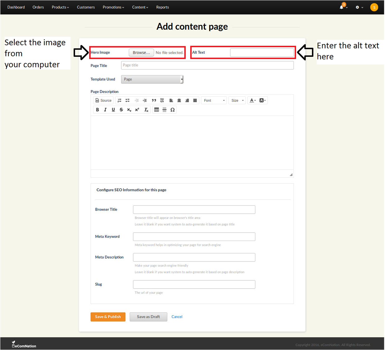 5. Upload the Hero image and enter the alt text for the same image.